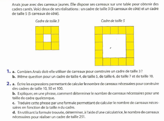 Le nombre de carreaux du cadre est : \(4 \times n-4\) ou bien \(2 \times n +2 \times (n-2)\) et en fait ces deux expressions sont égales, quel que soit le n choisit ('au pif' !!!)