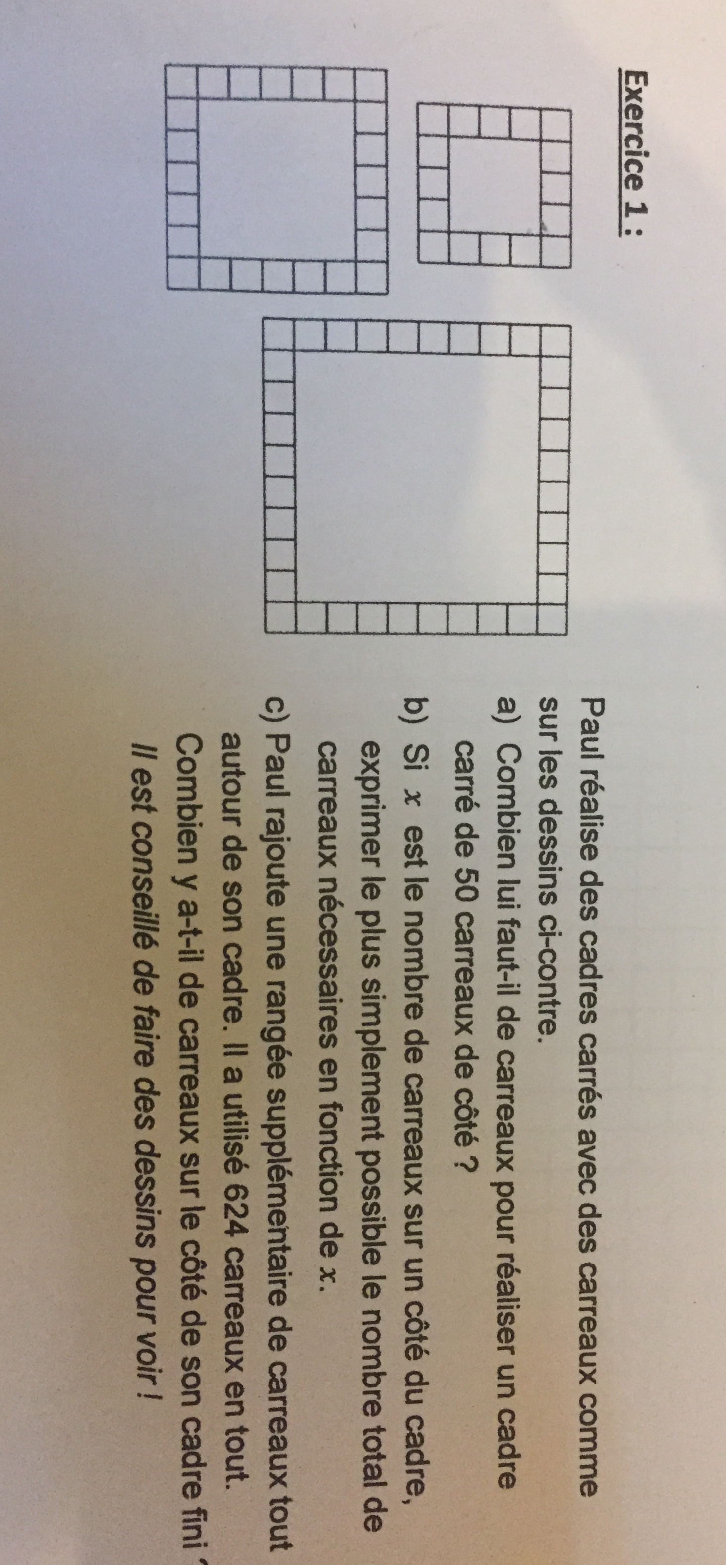 Pour ce qui concerne ton exercice, as tu regardé les exemples donnés? As tu compté le nombre de carreaux sur le côté de chaque cadre carré et combien il y a au total de carreaux? Commence par ça tu devrais trouver une piste.