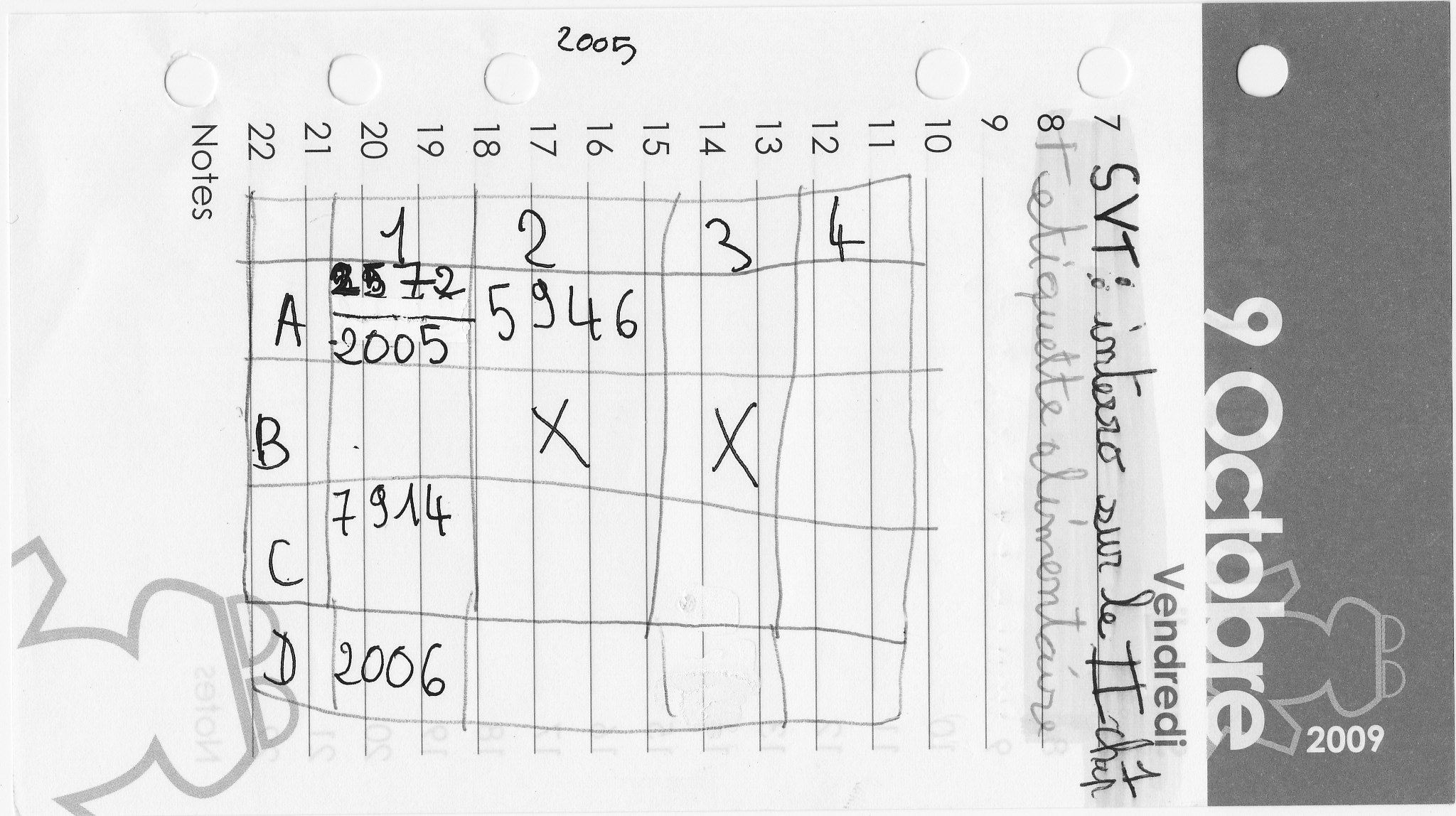 2) Dans chaque case tu dois écrire un chiffre du nombre que tu as trouvé, par exemple : ligne D 2006 donne 2 dans la première case (D1), 0 dans la deuxième (D2), 0 dans la troisième...