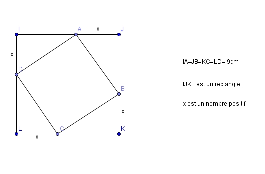 Chaque sommet du carré ABCD appartient à l'un des côtés du carré IJKL. x est un nombre positif.