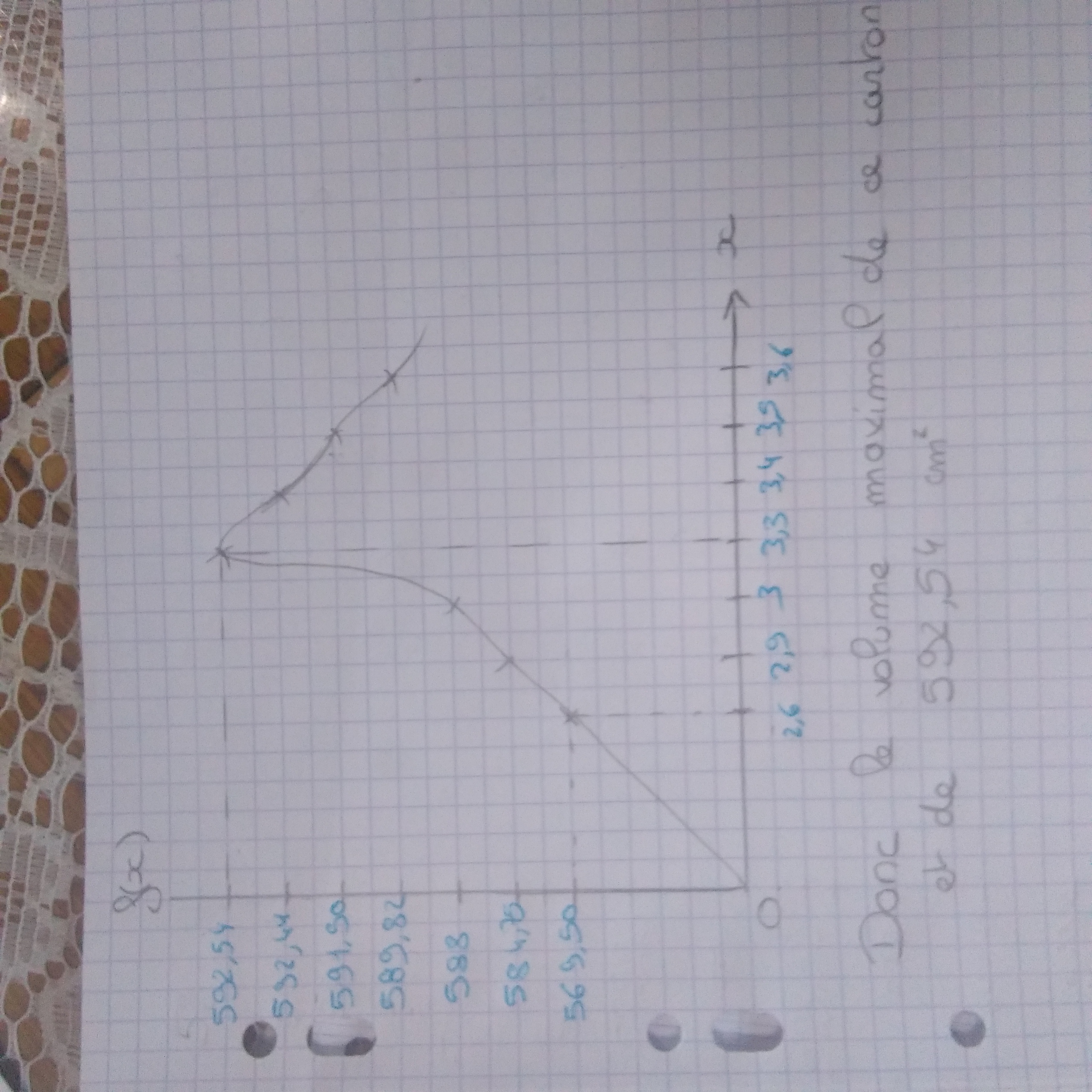 Par contre, ton graphique n'est pas correct en ce qui concerne les nombres positionnés sur l'axe des ordonnées : il faut respecter une échelle : par exemple 1 cm sur le dessin représente 50 cm^3.