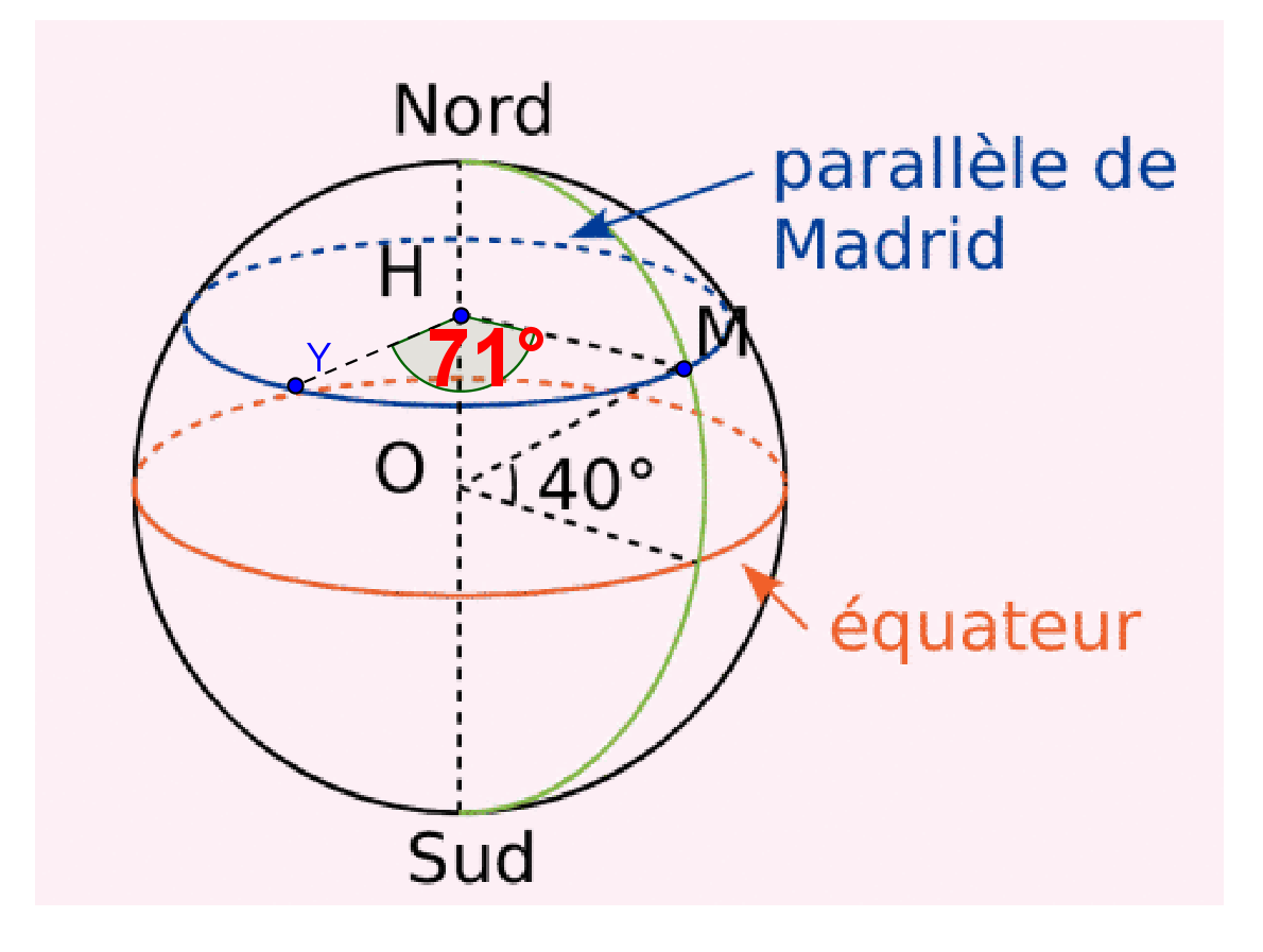 Par exemple New York, représentée par un point Y est à la même latitude que Madrid (donc sur le même parallèle) mais à une longitude de 74° ouest, il y a donc 74-3 degrés d'écart :\(\widehat{MHY}=74-3=71\)