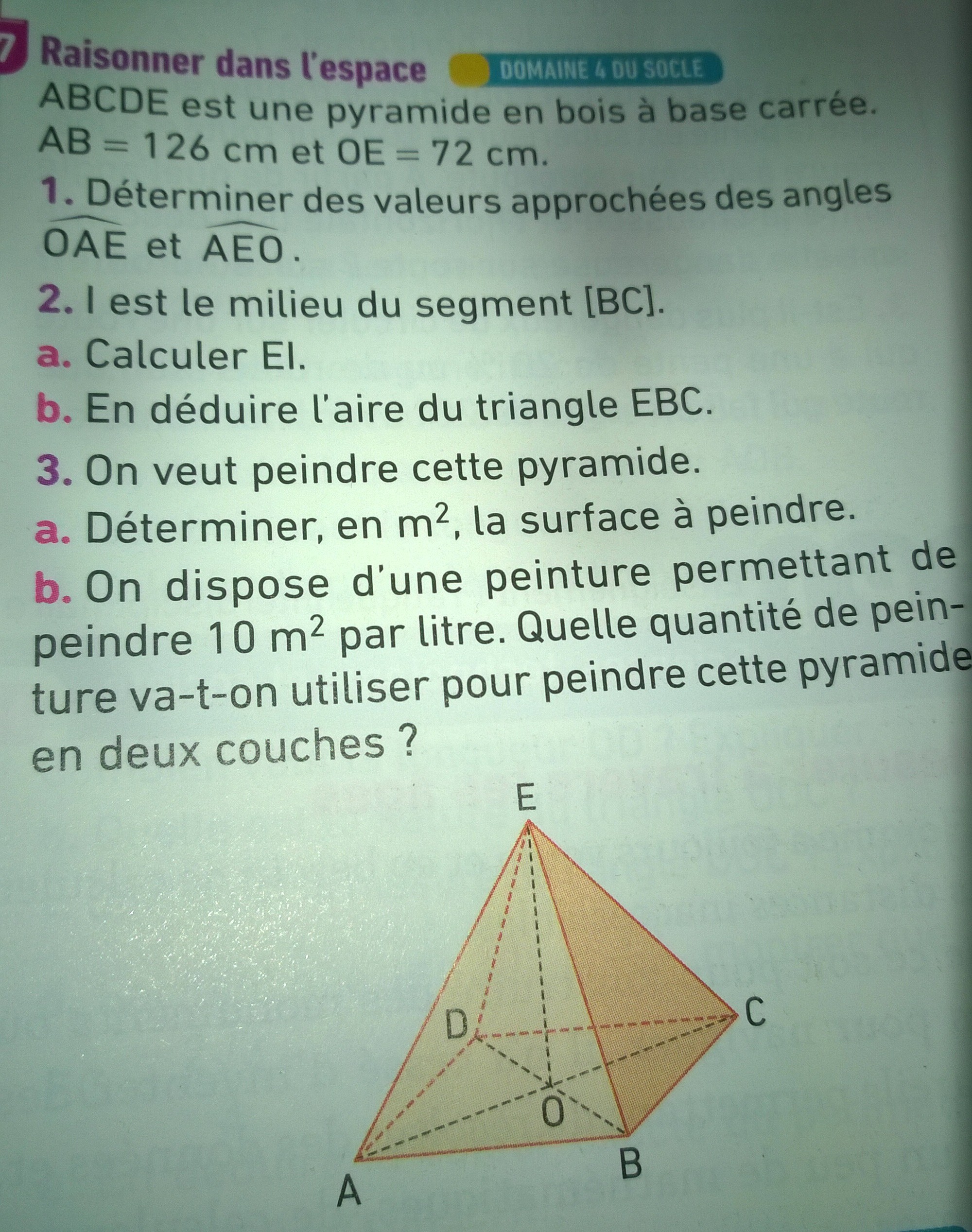Selon moi la nature du triangle AOE est un triangle rectangle en O. Vu que la base du triangle est un carré tous ces côtes sont de 126cm. Mais je ne comprend pas trop comment trouver la longueur de AO.