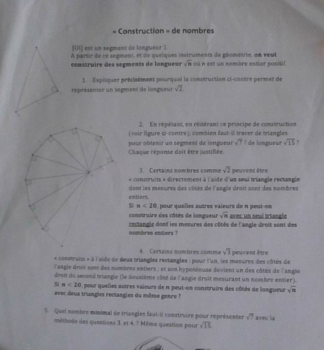 Sur cette hypoténuse tu construis un triangle rectangle dont le deuxième côté de l'angle droit mesure encore 1. Donc par Pythagore, ta nouvelle hypoténuse vaudra \(\sqrt{\left(\sqrt(2)\right)^2+1^2}=\sqrt{2+1}=\sqrt{3}\) et ainsi de suite.