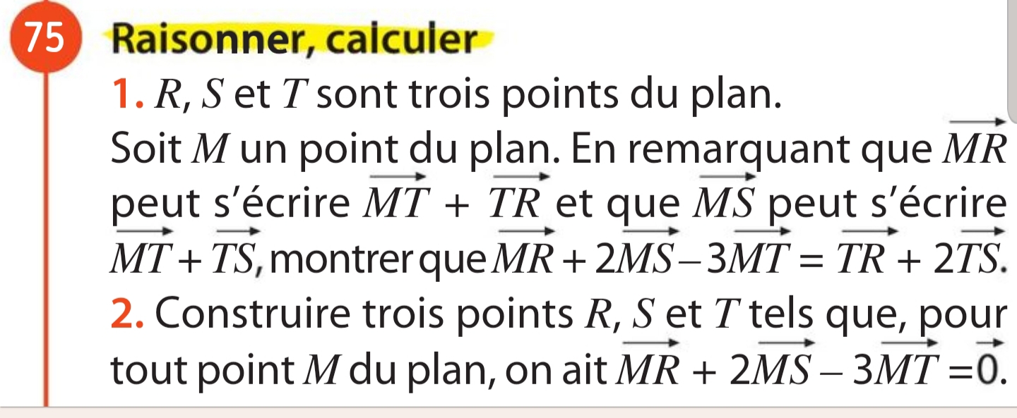 Ensuite, dans la relation \(\overrightarrow{MR}+2\overrightarrow{MS}-3\overrightarrow{MT}\), tu vas remplacer les deux premiers vecteurs par leur expression obtenue juste au-dessus et les vecteurs \(\overrightarrow{MT}\) vont disparaître.