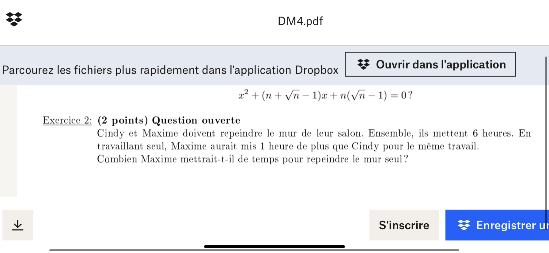 "Cindy et Maxime doivent repeindre le mur de leur salon. Ensemble, ils mettent 6 heures. En travaillant seul, Maxime aurait mis 1 heure de plus que Cindy pour le même travail.