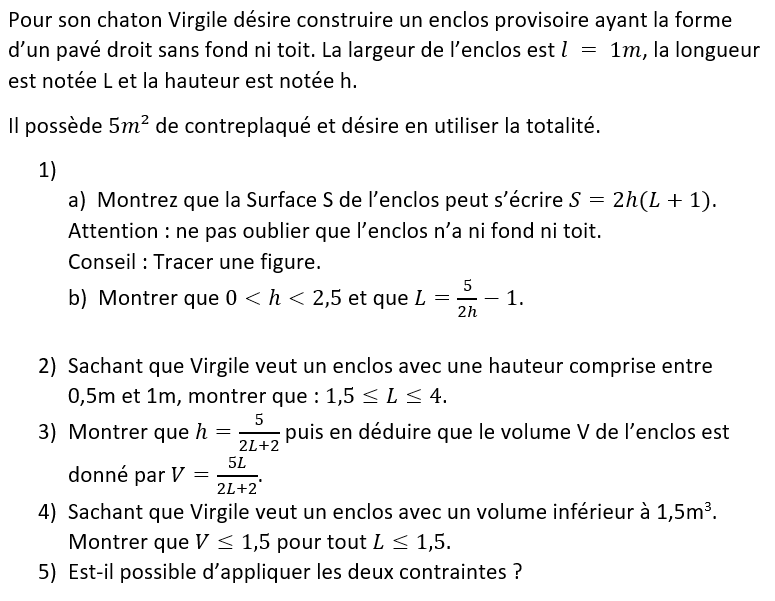 V = L x 1 x h donc V = L x 5/2 (L + 1).