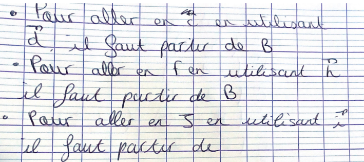 Je t'ai donné la fin du chemin en donnant le vecteur qui permet de passer d'un point à l'autre et il te reste à trouver le début du chemin, et je te donne une indication de partir du point \(F\).