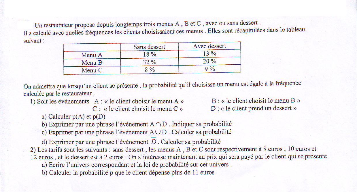 C'est à dire la probabilité de choisir le menu A et la probabilité de choisir un menu sans dessert