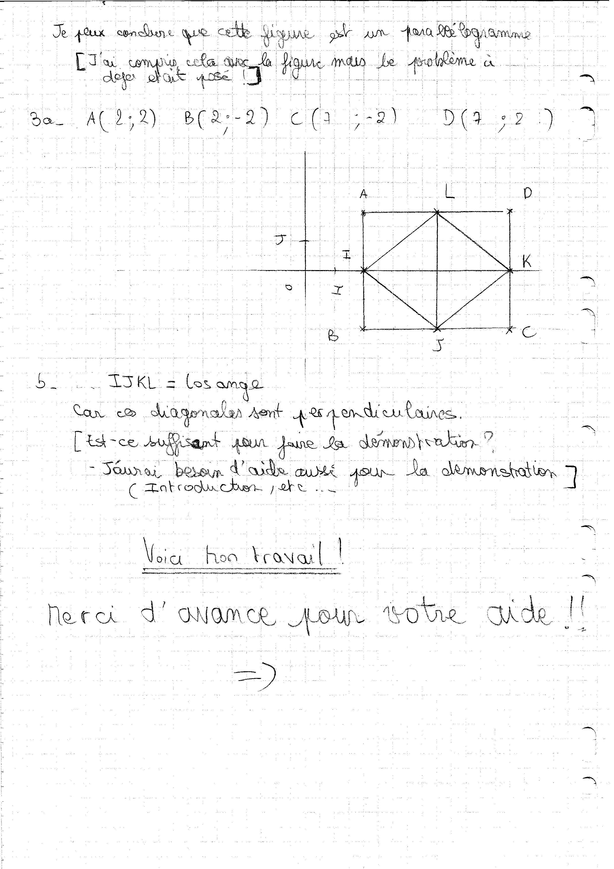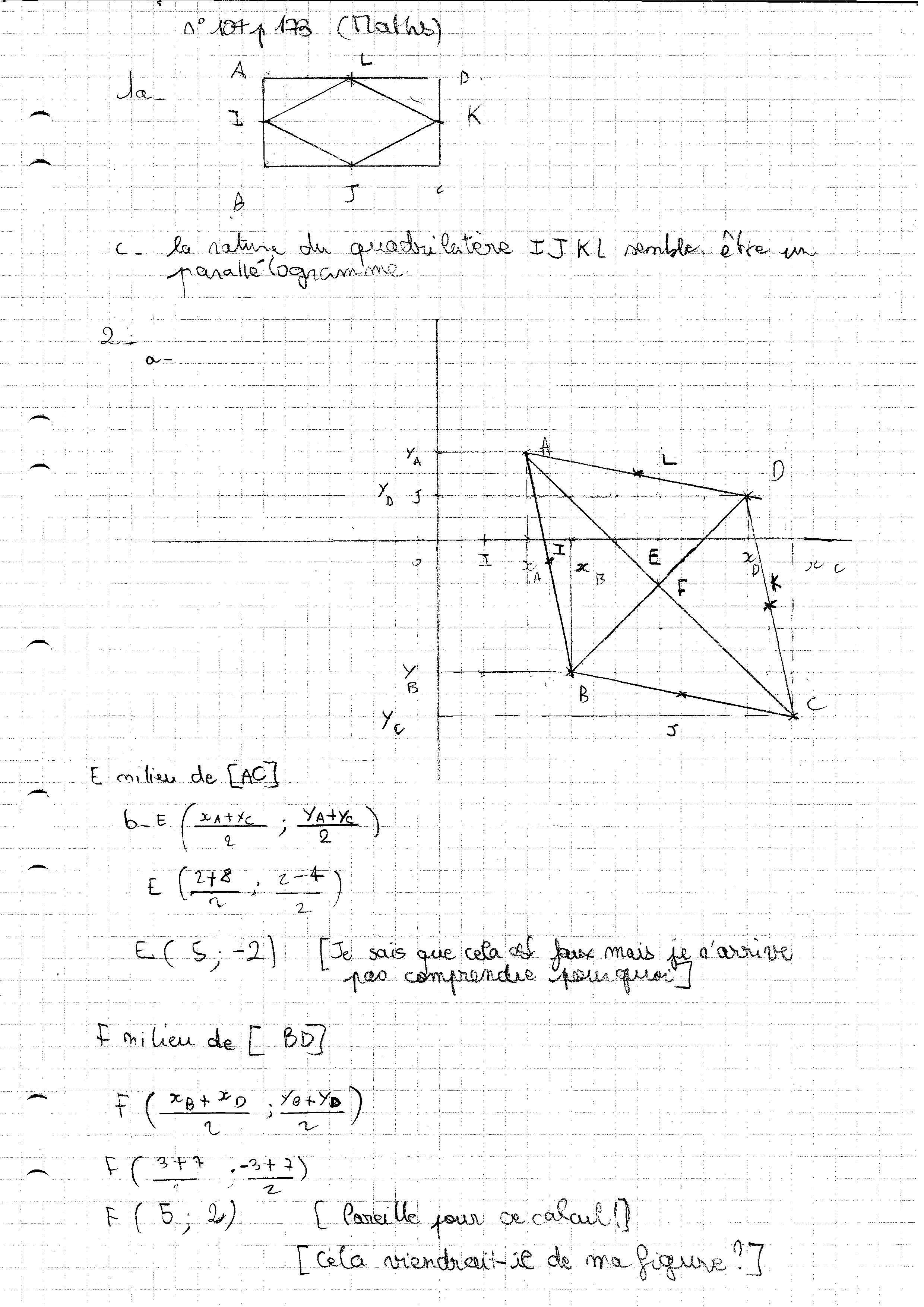 Vous devez calculer les coordonnées des milieux de chaque côté puis calculez les coordonnées des milieux des diagonales de IJKL