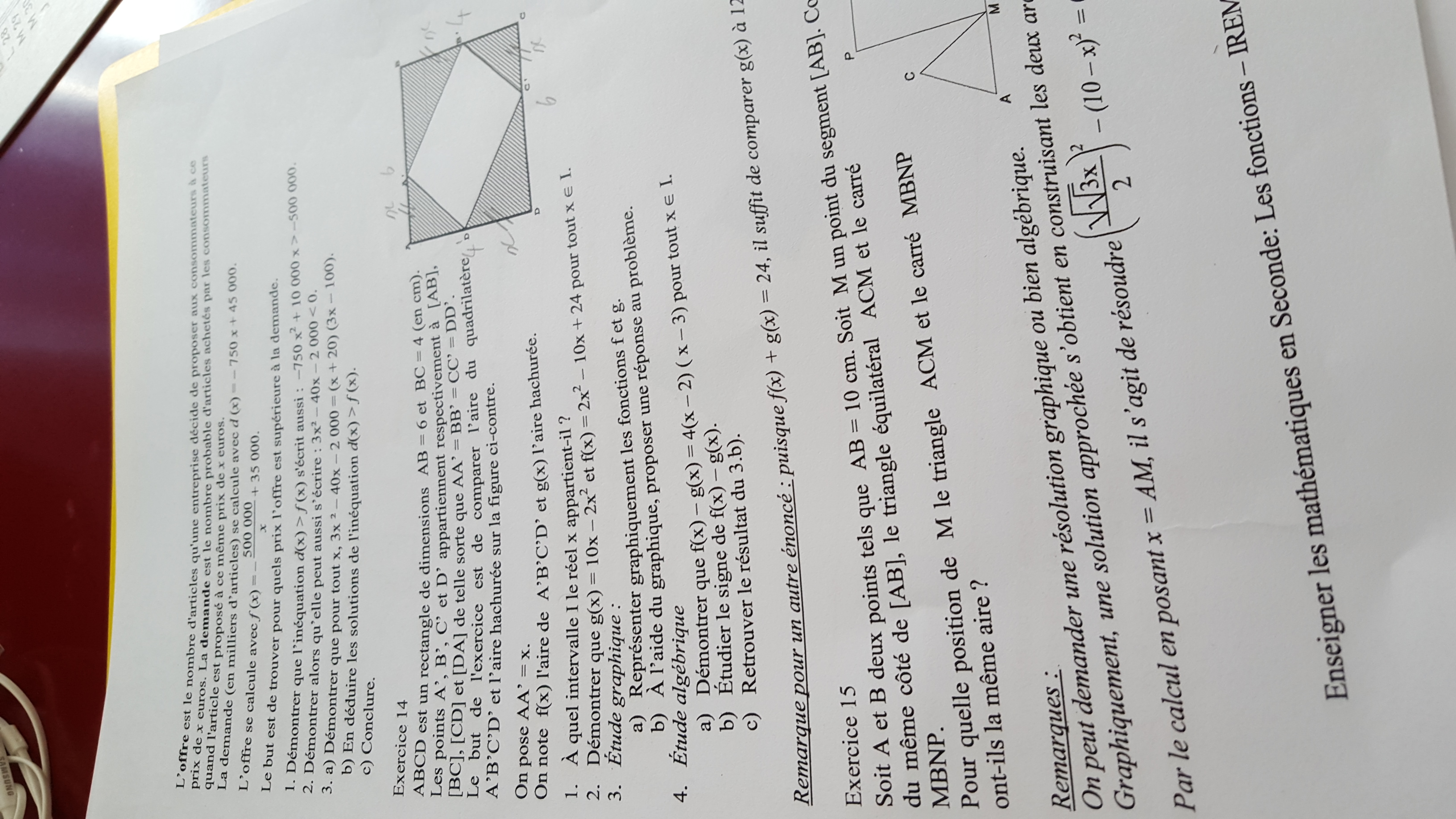 Merci pour vos précisions, le problème c'est que je ne trouve pas le même résultat algébriquement que graphiquement. Je trouve 12 et 12 graphiquement et 8 et 12 algébriquement donc je ne sais pas si c'est normal.