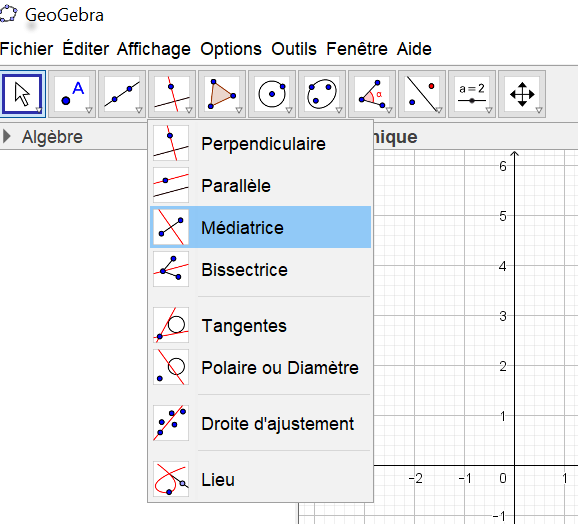 dans GeoGebra, tu as directement une commande médiatrice : Il te suffit ensuite de cliquer sur le segment pour lequel tu veux avoir la médiatrice.
