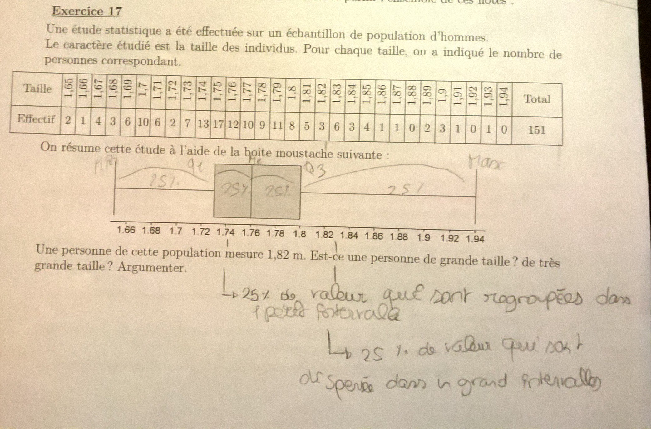 Comme on a le tableau des tailles, on voit que 21 personnes sur 151 ont une taille strictement supérieure à 1,82 m. Selon toi, peut-on qualifier la personne de 1,82 m de très grande taille ?