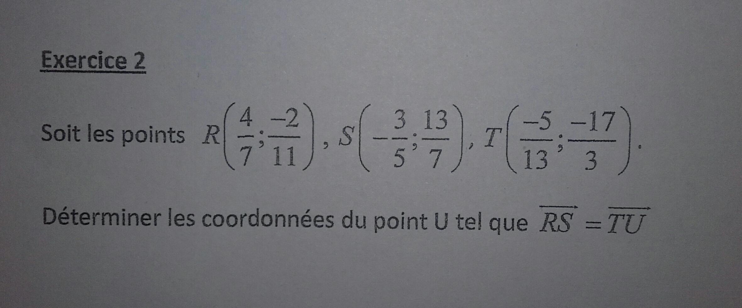 Soit les points R (4/7 ; -2/11), S(- 3/5 ; 13/7), T(-5/13 ; -17/3). Déterminer les coordonnées du point U tel que vecteur RS = vecteur TU.