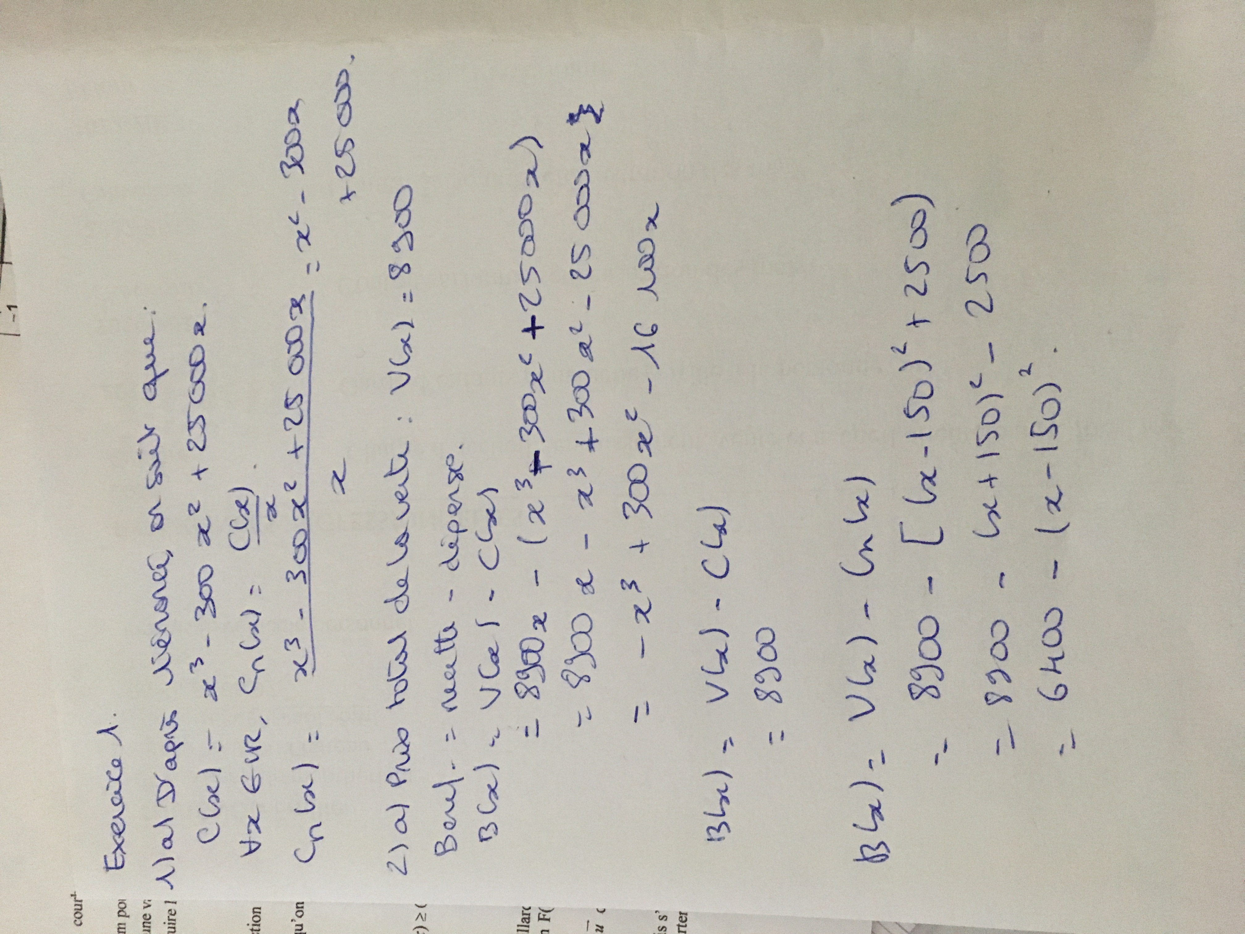 Oui je n'arrive pas à la 2)à).. est ce bien V(x) = 8900 x ? Mais je n'arrive pas à résoudre B(x) = V(x) - C(x)