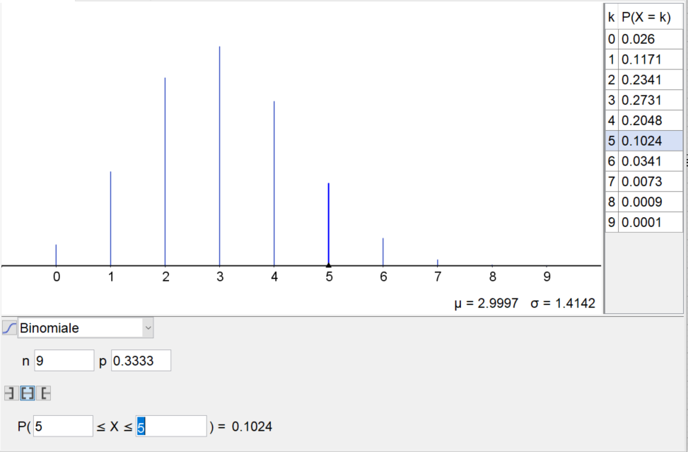 Oui, voici ce que donne le logiciel Geogebra dans sa partie probabilité (l'utiliser en parallèle de ta calculatrice te permettra de contrôler toi même tes résultats... La formule est à écrire à mon avis : \(p(X=5)=\binom{9}{5} \times (\frac{1}{3})^5 \times (\frac{2}{3})^4\) puis l'application que tu donnes.