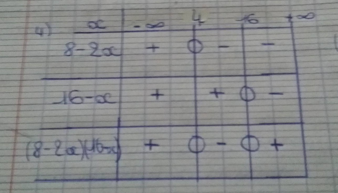 Puis tu regardes dans la ligne de x (la 1ère) les valeurs de x pour lesquelles (8-2x)(16-x) est négatif.