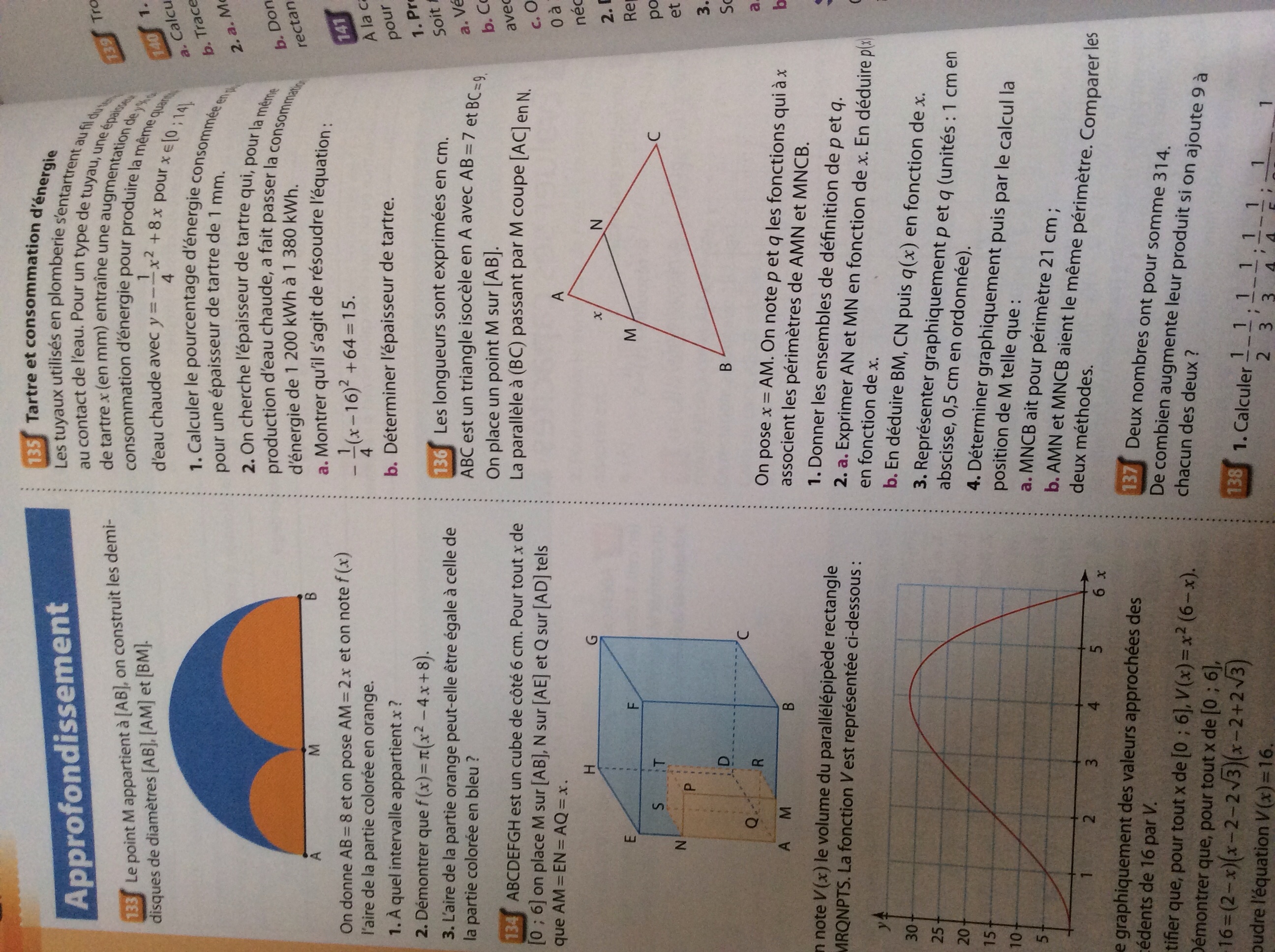 Après je ne comprend pas d'où vous sortez le 3 alors que à la première question du n°62 p 48 on doit montrer que MN vaut X sur 3 puis que F(X)= 5X-X²sur 3.