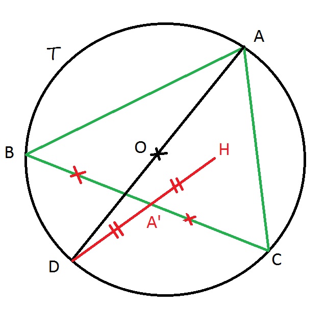 T est le cercle de centre O circonscrit au triangle ABC. [AD] est un diamètre de T. H est le symétrique de D par rapport au milieu A' de [BC].