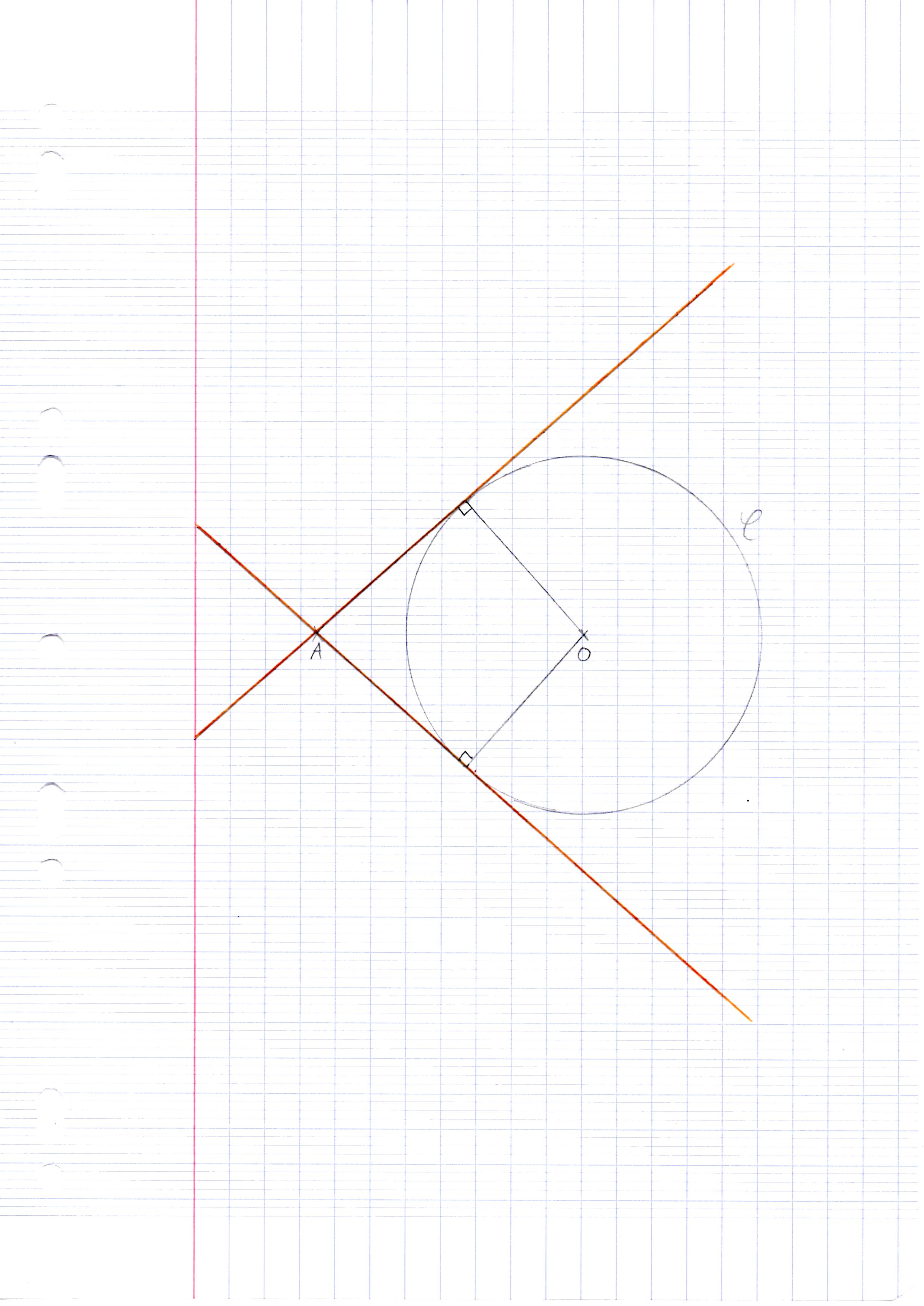 Bonjour, dans un exercice, on me demande de dessiner un cercle C de centre O et de rayon 4 cm, un point A tel que OA = 6 cm et les 2 tangentes à C en orange passant par A.