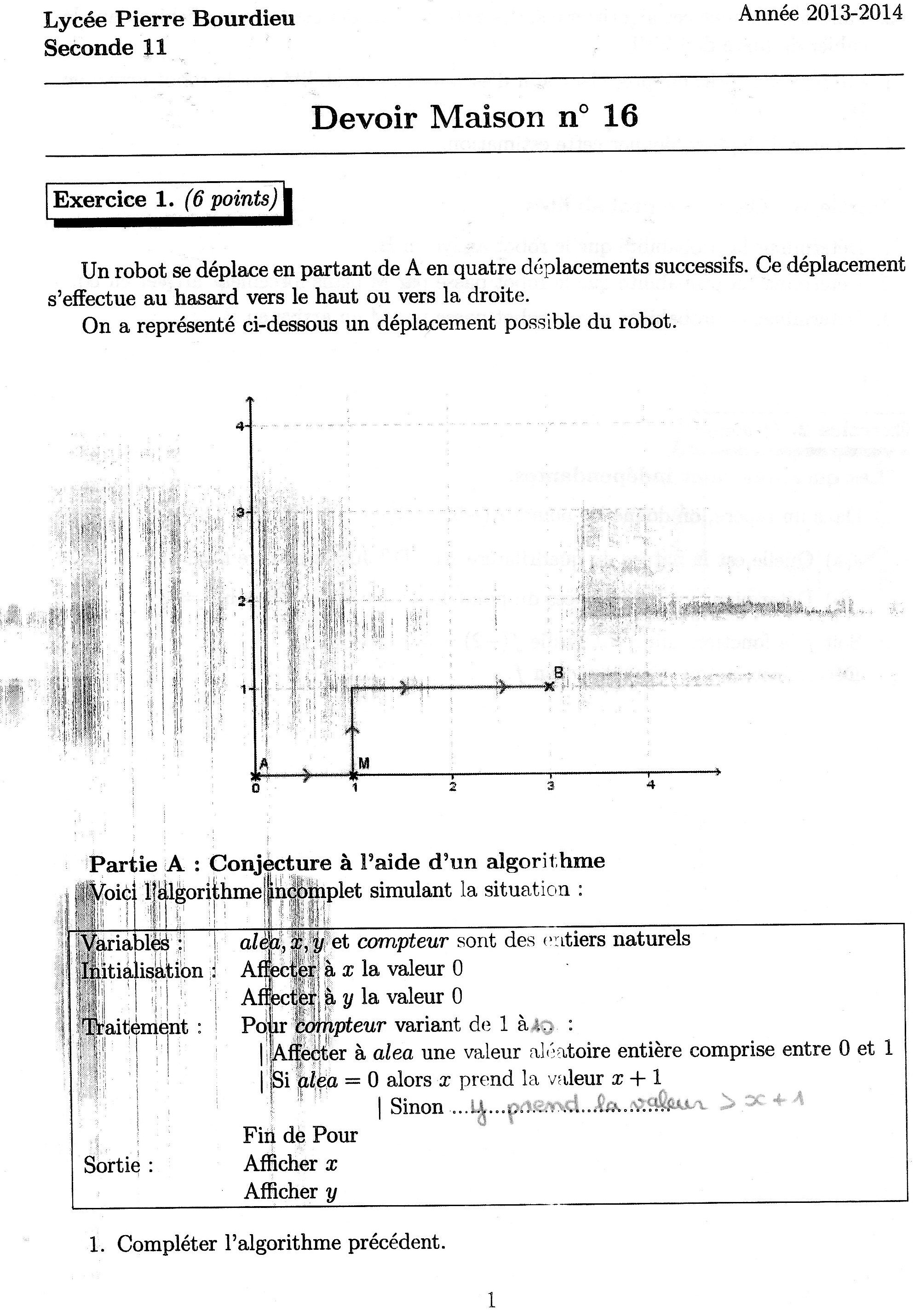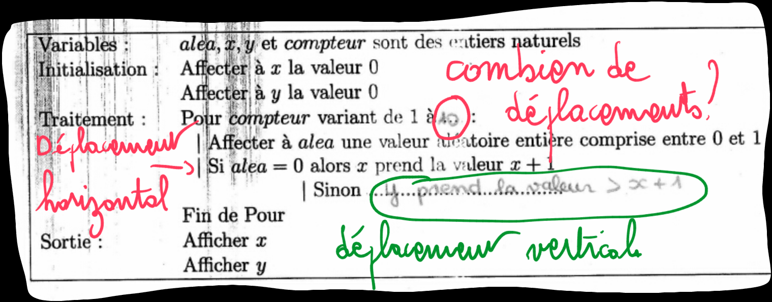 Ensuite si le nombre aléatoire tombe sur 0, c'est un déplacement horizontal donc si le nombre aléatoire tombe sur 1, c'est un déplacement vertical donc il faut corriger ton algorithme :