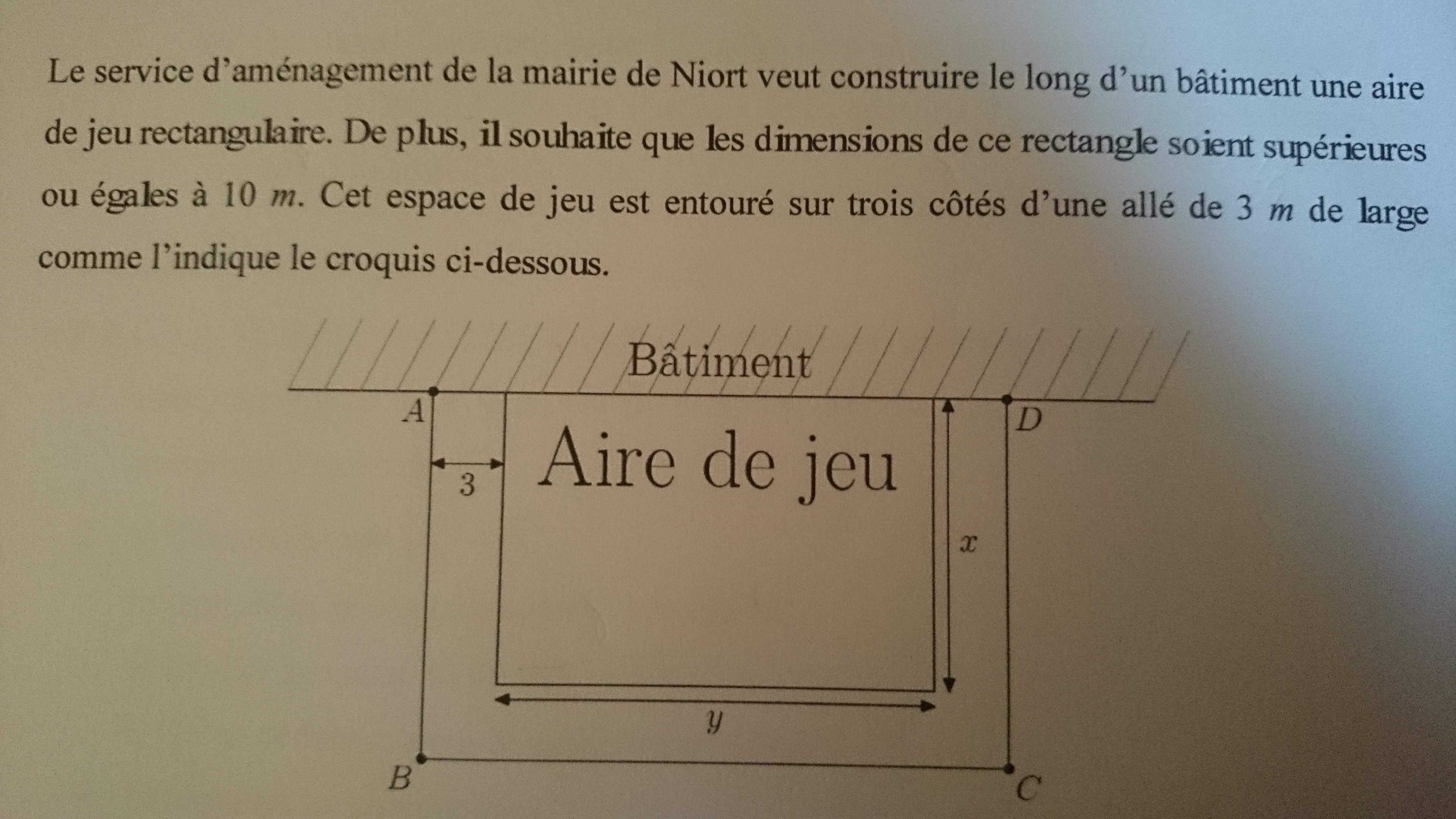 Sachant que l'ensemble est clôturé sur les trois côtés AB, BC et CD. On s'intéresse à la longueur L de la clôture L=AB+BC+CD. On note x et Y les dimensions en mètres de l'aire de jeu.