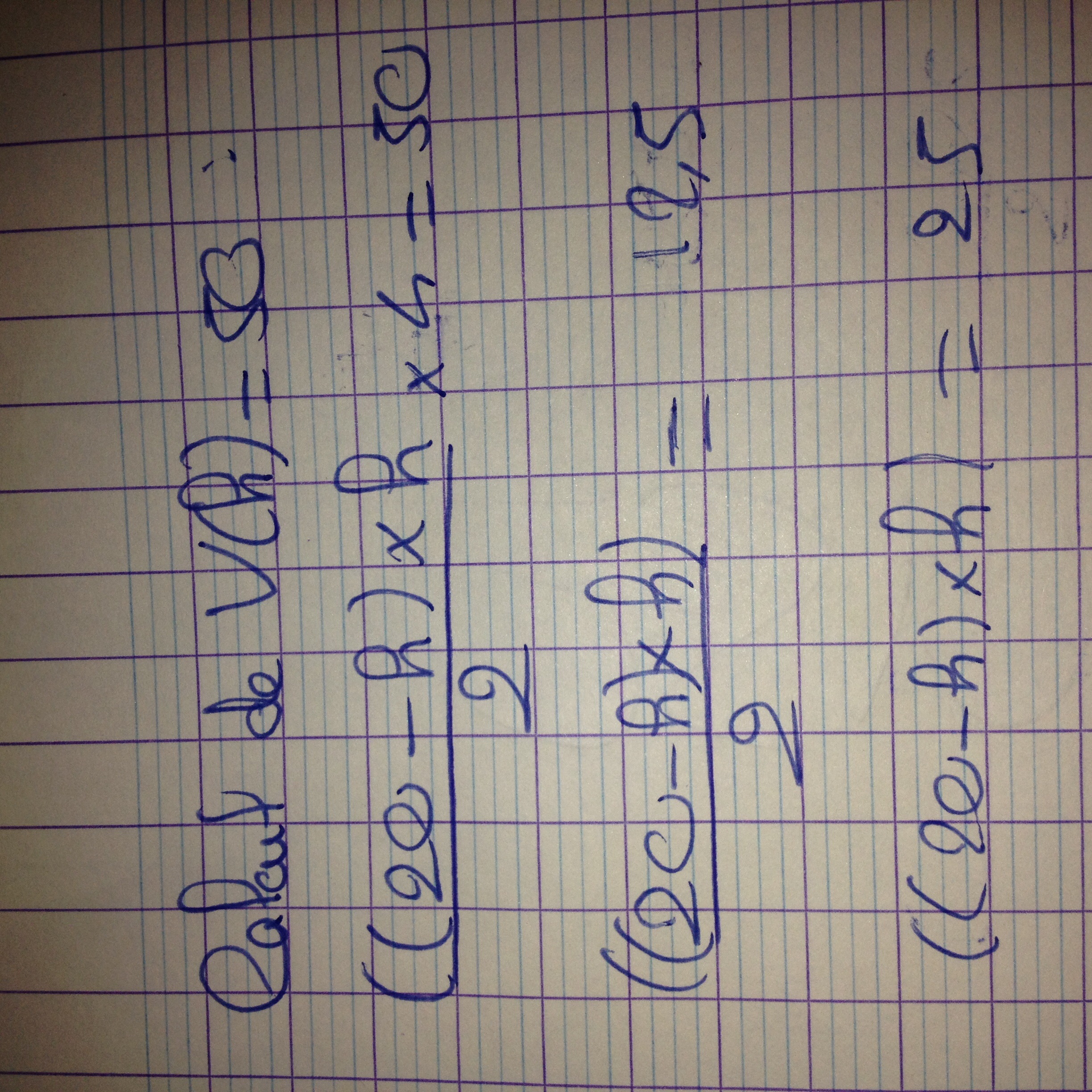 Bonjour, pour la question 5 j'ai trouvé que la fonction qui à h associe le volume V(h) de sucre restant était V(h)-->(((20-h)x h)/2)x 4 mais je n'arrive pas à résoudre la première équation de la partie C. Voici le calcul que j'ai commencé à faire