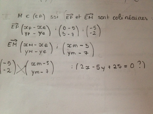 On a E (5;7) et P(0,7). il faut démontrer que M( x;y) est un pt de la droite (EP) ssi 2x-5y+25=0