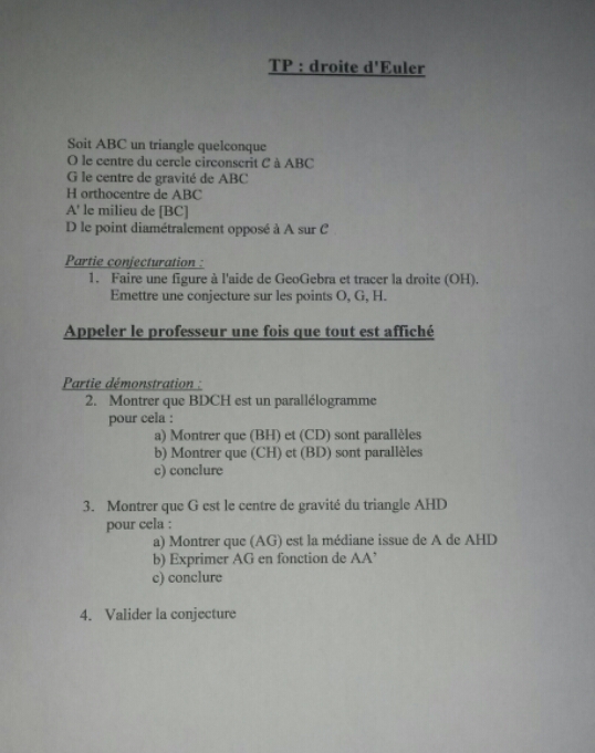 Voilà où j'en suis, j'ai un problème sur ma figure mes diagonales ne se coupe pas en A' je pense que D est mal placer pourtant pour le tracé j'ai pris la longueur (AO) et je l'ai reporté sur le cercle un peu au hasard, maintenant j'en suis au 3)a on me demande De montrer que G est le centre de gravité du triangle AHD.