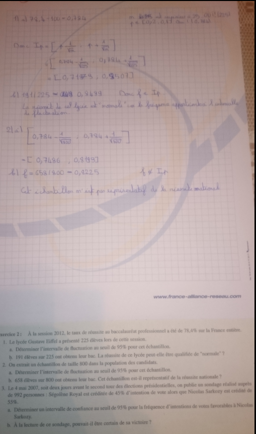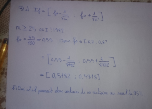 Comme l'intervalle de confiance dépassait 50%, on peut dire que N. Sarkozy pouvait être confiant dans sa victoire au risque de se tromper dans 5% dans des cas.