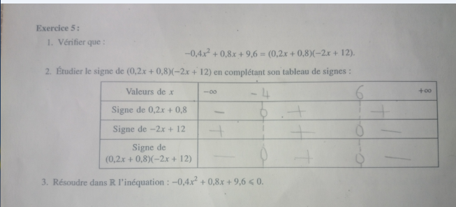 Enfin pour la question 3 j'ai mis : ] - infini ; - 4 ] U [ 6 ; + infini [