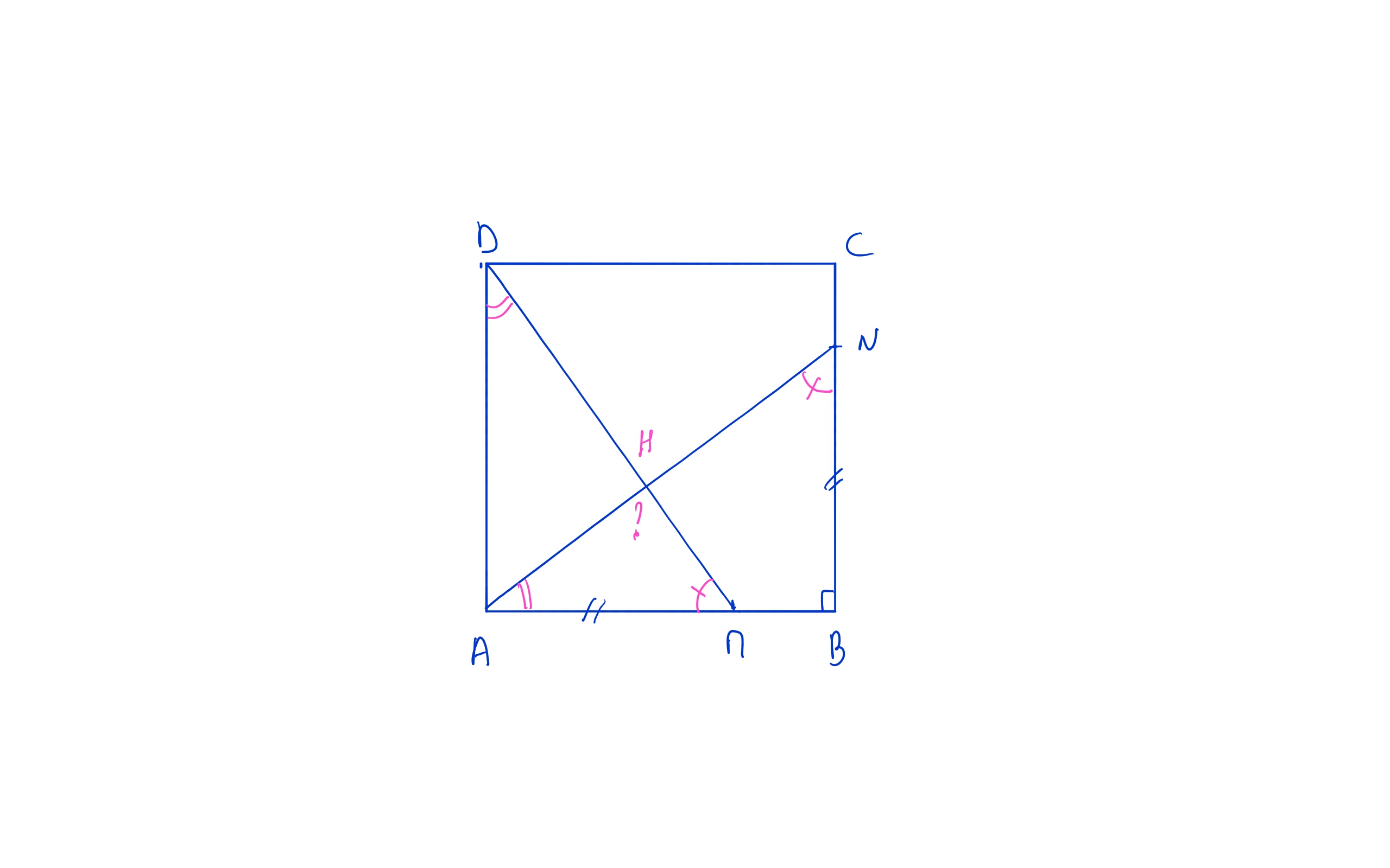 j'imagine que tu as fait un schéma pour te représenter la situation. Tes triangles \(ABN\) et \(ADM\) sont rectangles donc leurs angles aigus sont complémentaires et deux à deux égaux.
