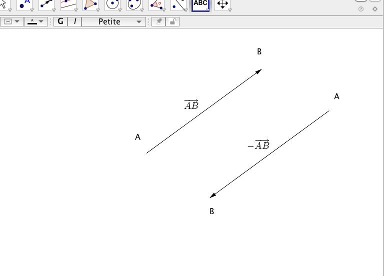Tu peux tracer un autre vecteur qui "va vers le bas" qui est bien le vecteur \(-\vec{AB}\) mais les deux points utilisés (l'origine et l'extrémité) pour tracer un représentant de ce vecteur doivent porter un autre nom ; par exemple R et T. Sur la figure que tu as proposée, tu ne peux pas nommer les nouveaux points A et B. On ne peut pas avoir dans une figure deux points différents qui portent le même nom.