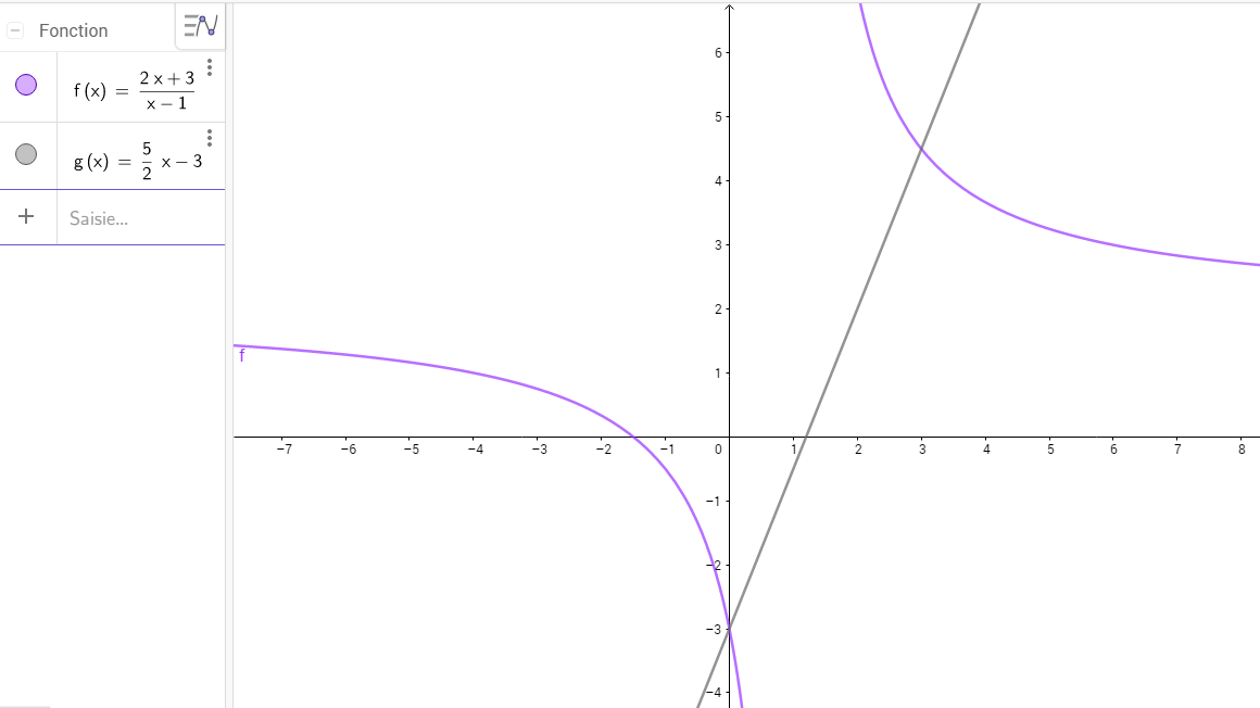 f et g sont les fonctions définies par : f (x) =(2x+3)/(x+1) pour x différent de 1 et g(x)= (5/2)x-3