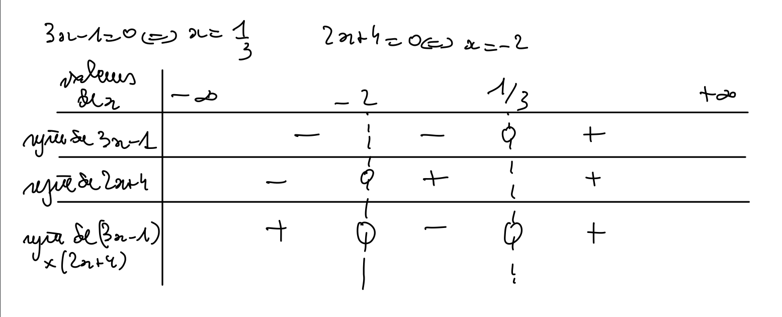 Voici un exemple : Et tu n'as plus qu'à lire les solutions dans la ligne du bas : l'inéquation \((3x-1)(2x+4)<0\) a pour solutions \(\left]-2\,;\,\dfrac{1}{3}\right[\).