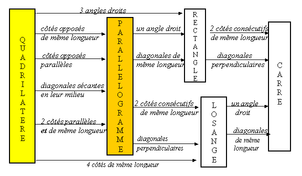Pour les quadrilatères, il fait bien évidemment connaître les propriétés relatives à leurs côtés, leurs angles et leurs diagonales, et savoir comment passer de l'un à l'autre : que faut-il rajouter à un quadrilatère pour qu'il devienne un parallélogramme ? Que rajouter à un parallélogramme pour avoir un rectangle ? Un losange ?
