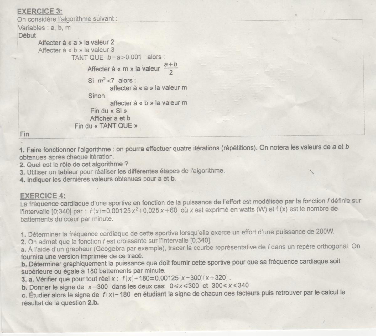 Pour l'exercice 3, je l'ai déjà fait fonctionné une fois comme vous me dites de faire et les résultats que j'obtiens (a=6.25 et b=3) ne me permettent pas de recommencer car ils ne remplissent pas les conditions du "tant que" (car 3-6.25<0.001). Trouvez-vous les même résultats que moi ?