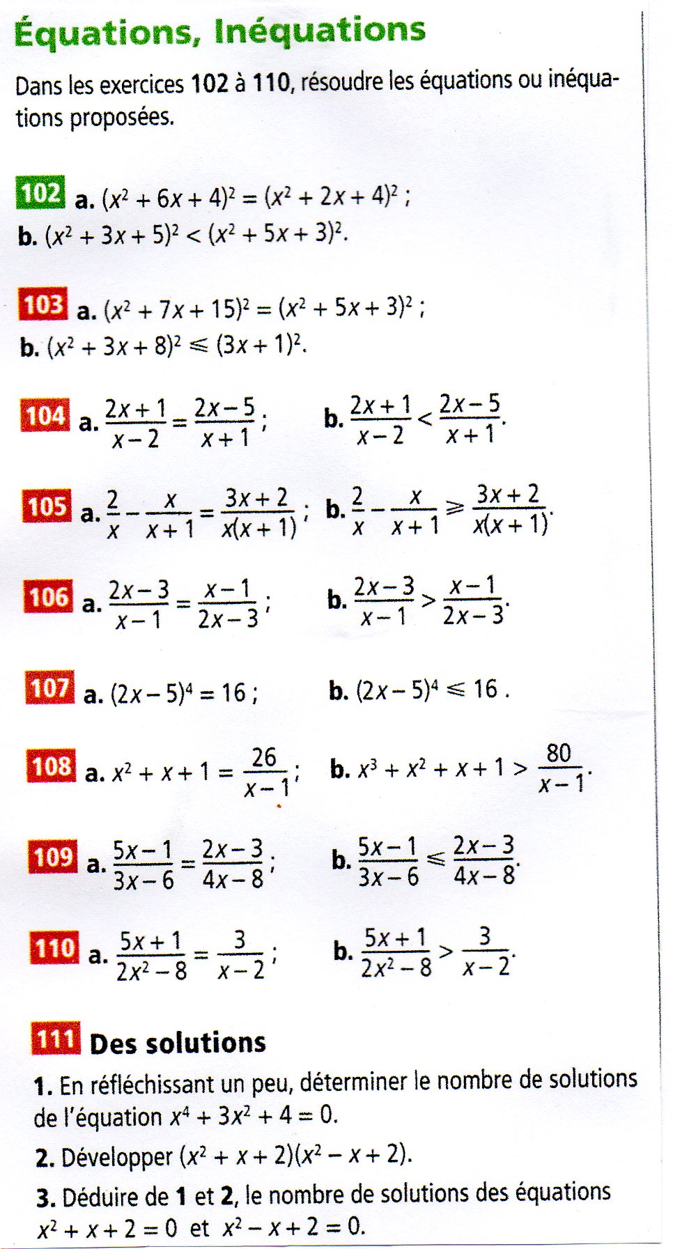 Pour l'inéquation du n°109, il faut d'abord transposer le quotient de droite à gauche puis mettre les deux quotients au même dénominateur