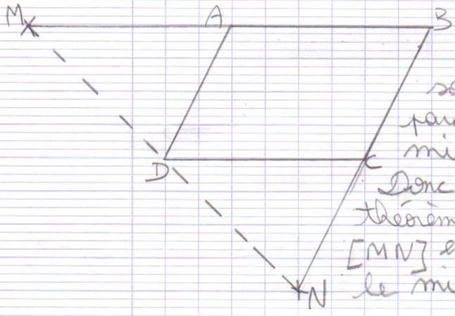 2) On sait que (AD) et (BC) sont paralléles, car ABCD est un parallélogramme et A est le milieu de (BM) car AM=AB. Donc d'aprés la réciproque du théoréme des milieux (AD) coupe [MN] en son milieux, donc d est le milieu de [MN].