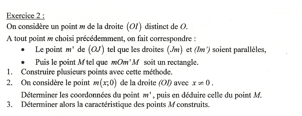 nous sommes dan un exercice ou le repère(O,I,J) est orthonormé je suis actuellement bloquer dans le problème du fichier joint. Alors en Classe nous avons fait la question 1 sur logiciel et on peut croire que la courbe représenter par M est celle de la fonction inverse. Je suis donc coincé à la question 2. Notre prof nous à dit d'utiliser les vecteurs. Je pense a utiliser les vecteurs colinéaire ( vecteurs Im' et vecteur mJ )quand je calcul les coordonnées des vecteurs je trouve (-1;y) pour Im et (-x;1) pour Mj. donc voila je vous serais grandement reconnaissant de pouvoir m'aider sur cette question 2.