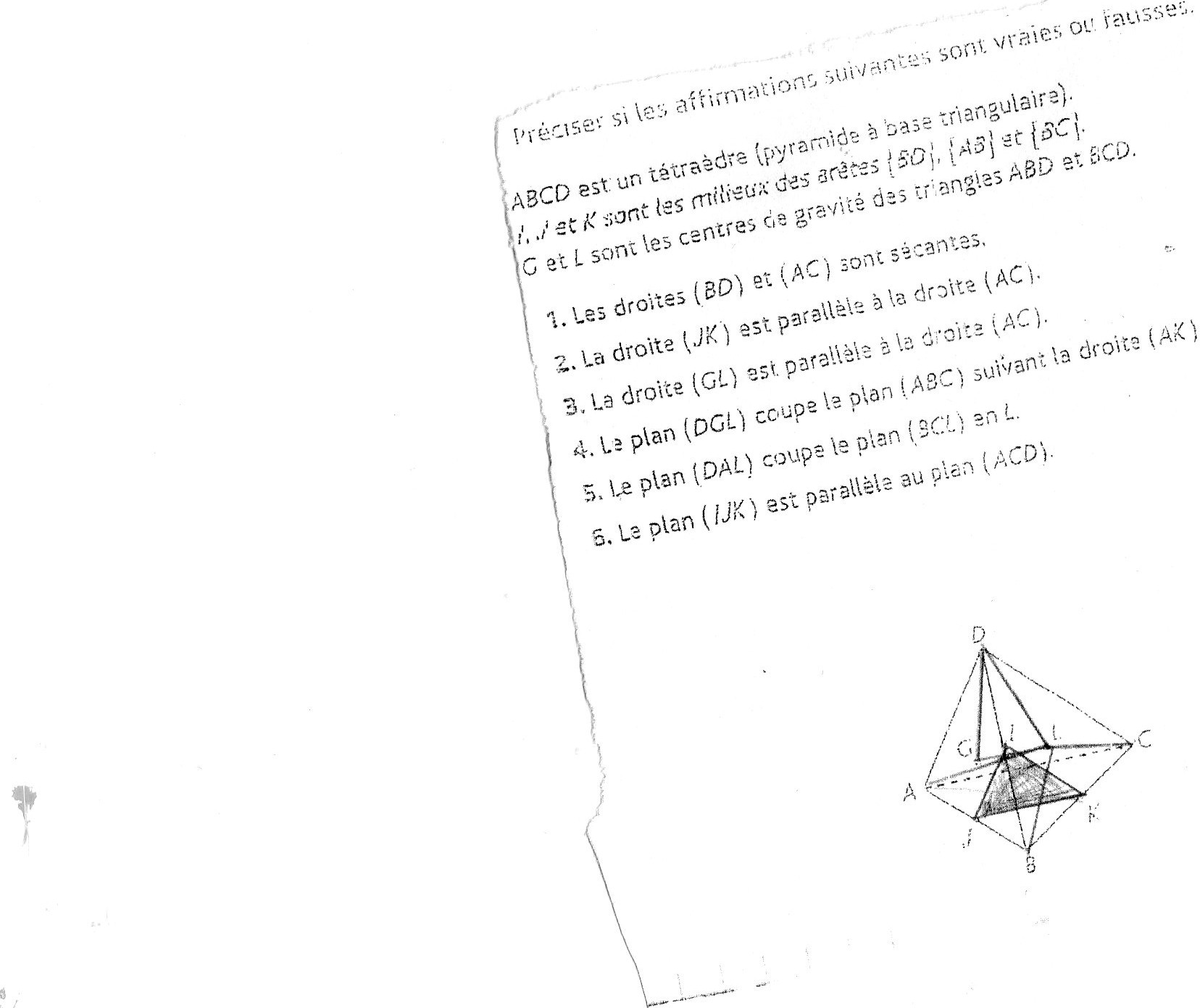 bonjour j'ai donc trouvé mes erreurs:pour la 1, les droites ne sont pas secantes car elles ne sont pas coplanaires