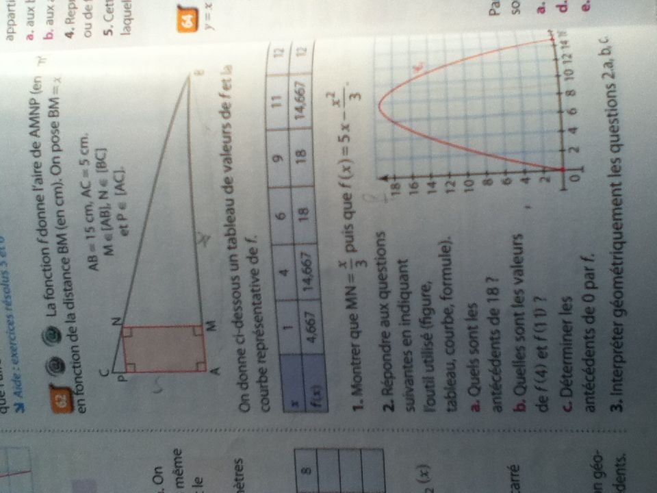 Comment fait-on pour trouver les antécédents de à avec pour équation f(x)=5x-x²/3 ! Et que veut on dire quand ils disent interpréter géométriquement, faut il faire une figure...