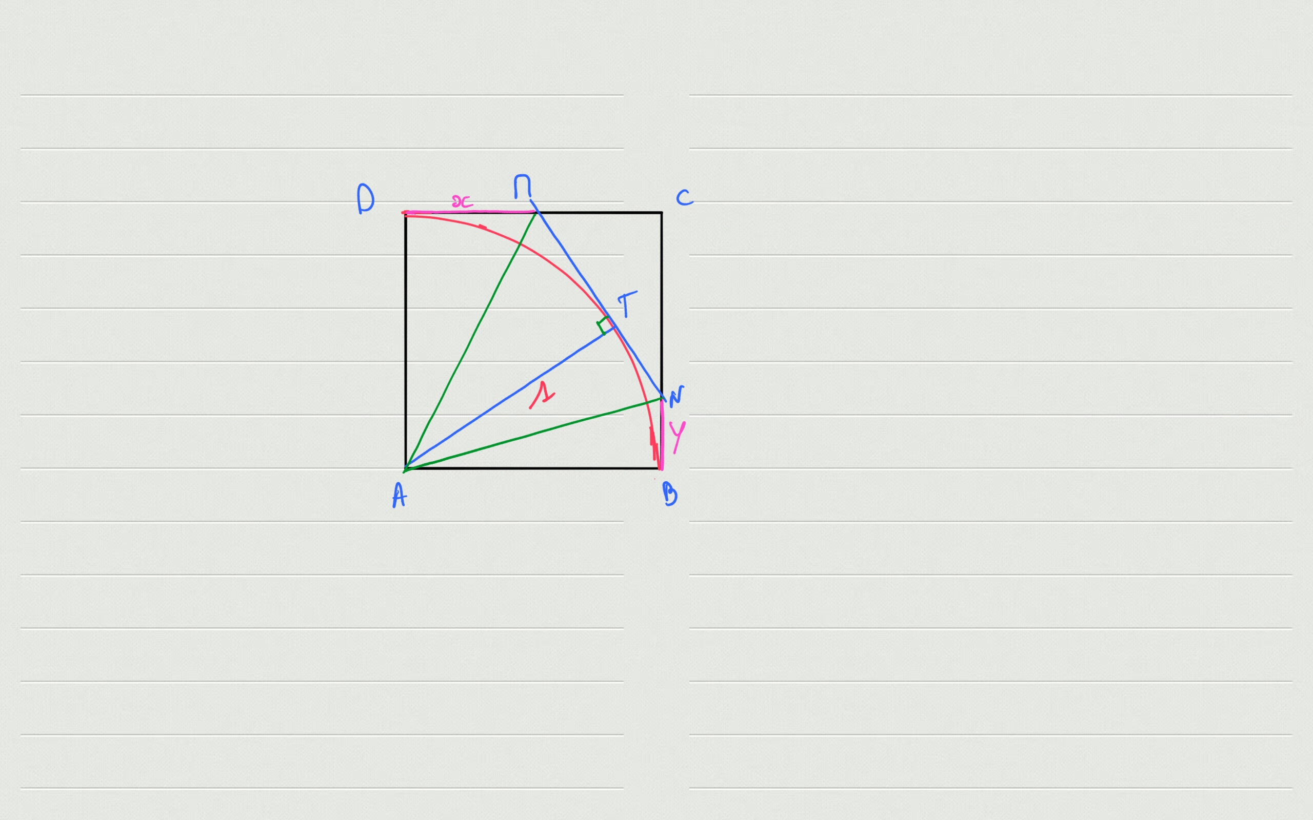 L'énnoncé de mon devoir de se présente ainsi "ABCD est un carré de côté 1, C est le quart de cercle de centre A et de rayon AB contenu dans le carré. T est un point de C, la tangente à C en T coupe [BC] en N. On note x = DM et y = BN."