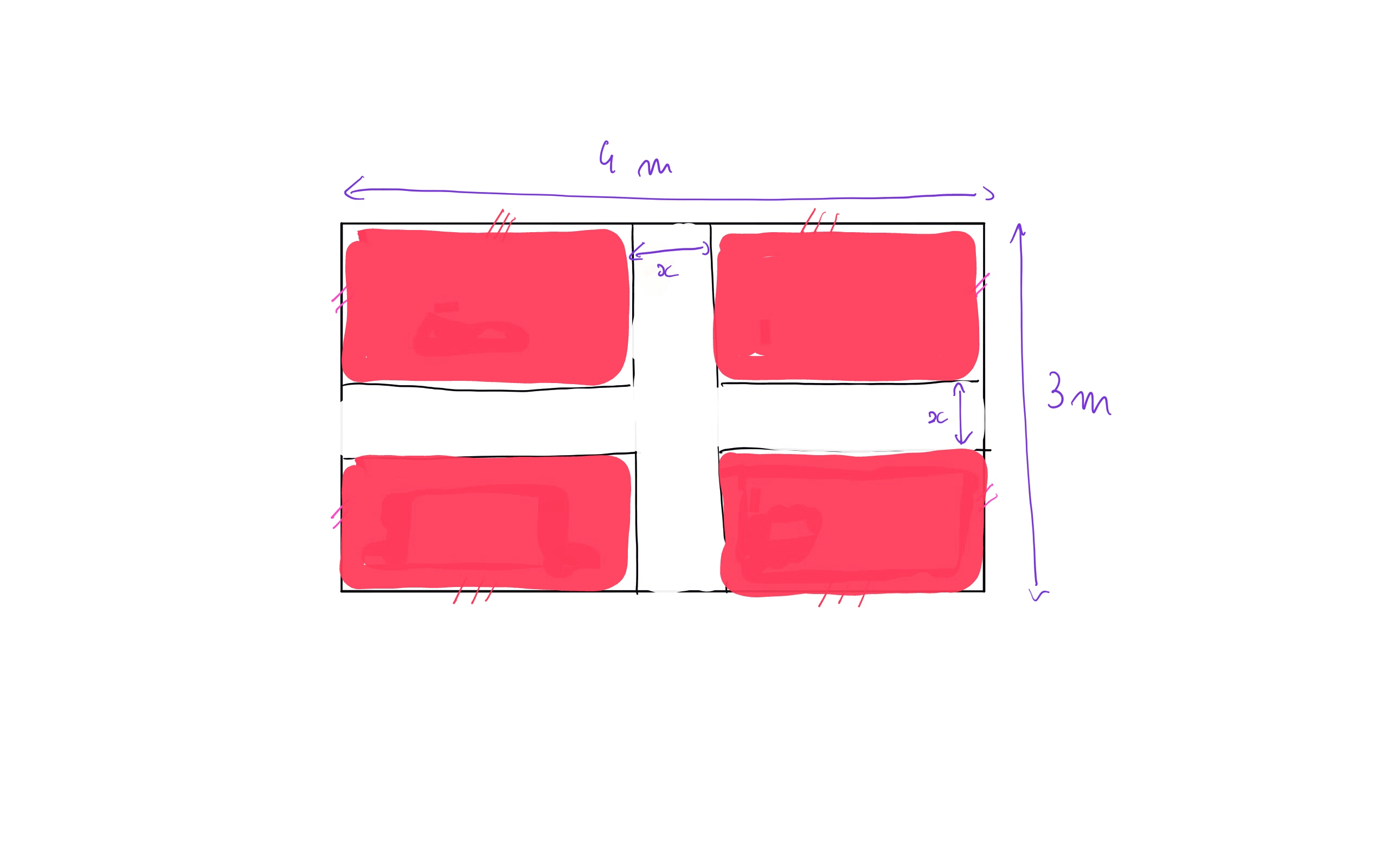 si x est la largeur de la bande il reste 4 - x pour la longueur des 2 rectangles