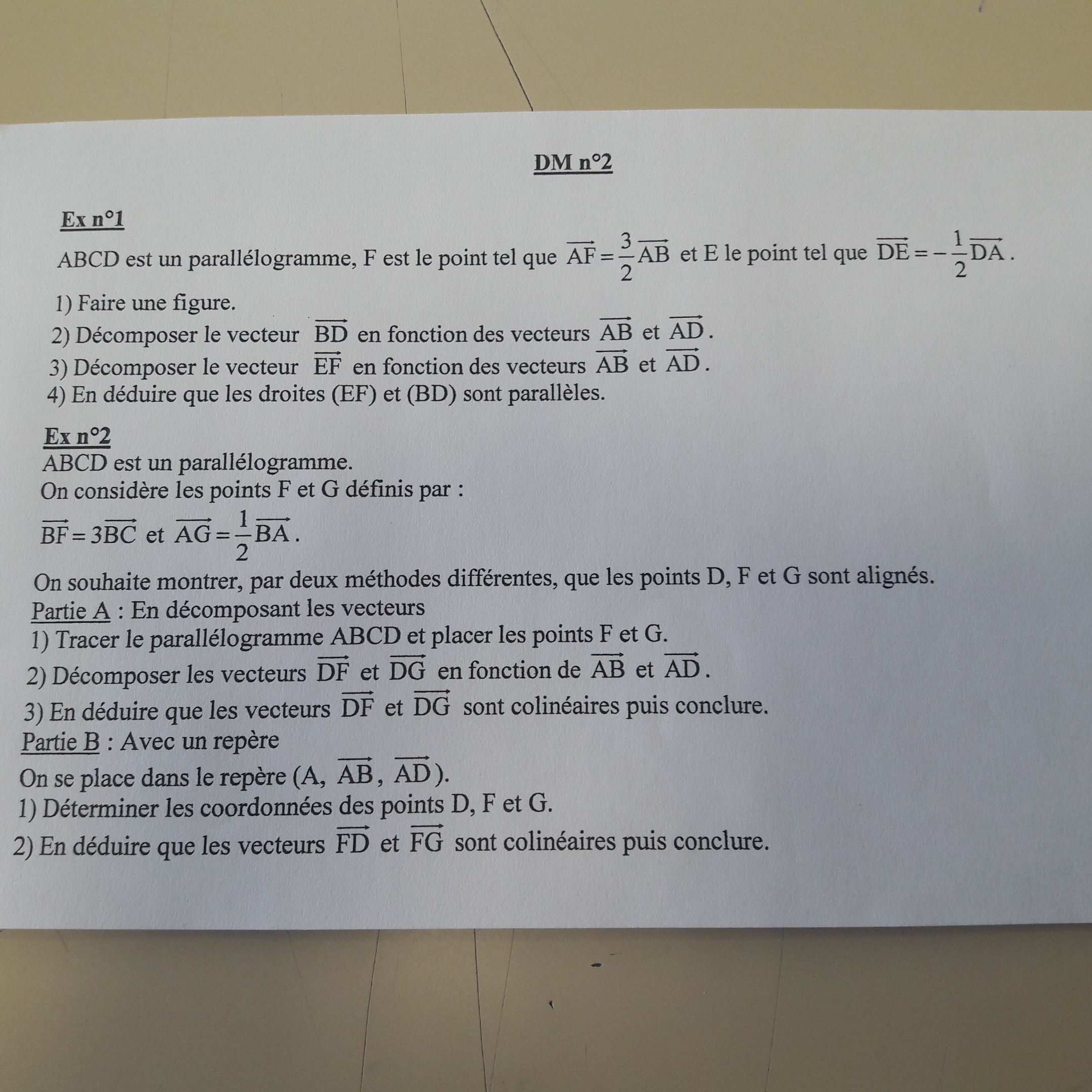 Nous n'arrivons a résoudre notre DM car nous ne comprenons pas la méthode de décomposition d'un vecteur. C'est pour cela que nous avons besoin de votre aide afin de pouvoir réaliser l'exercice 1 ainsi que la question 2 et 3 de la partie À de l'exercice 2 et enfin la question 2 de la partie B.