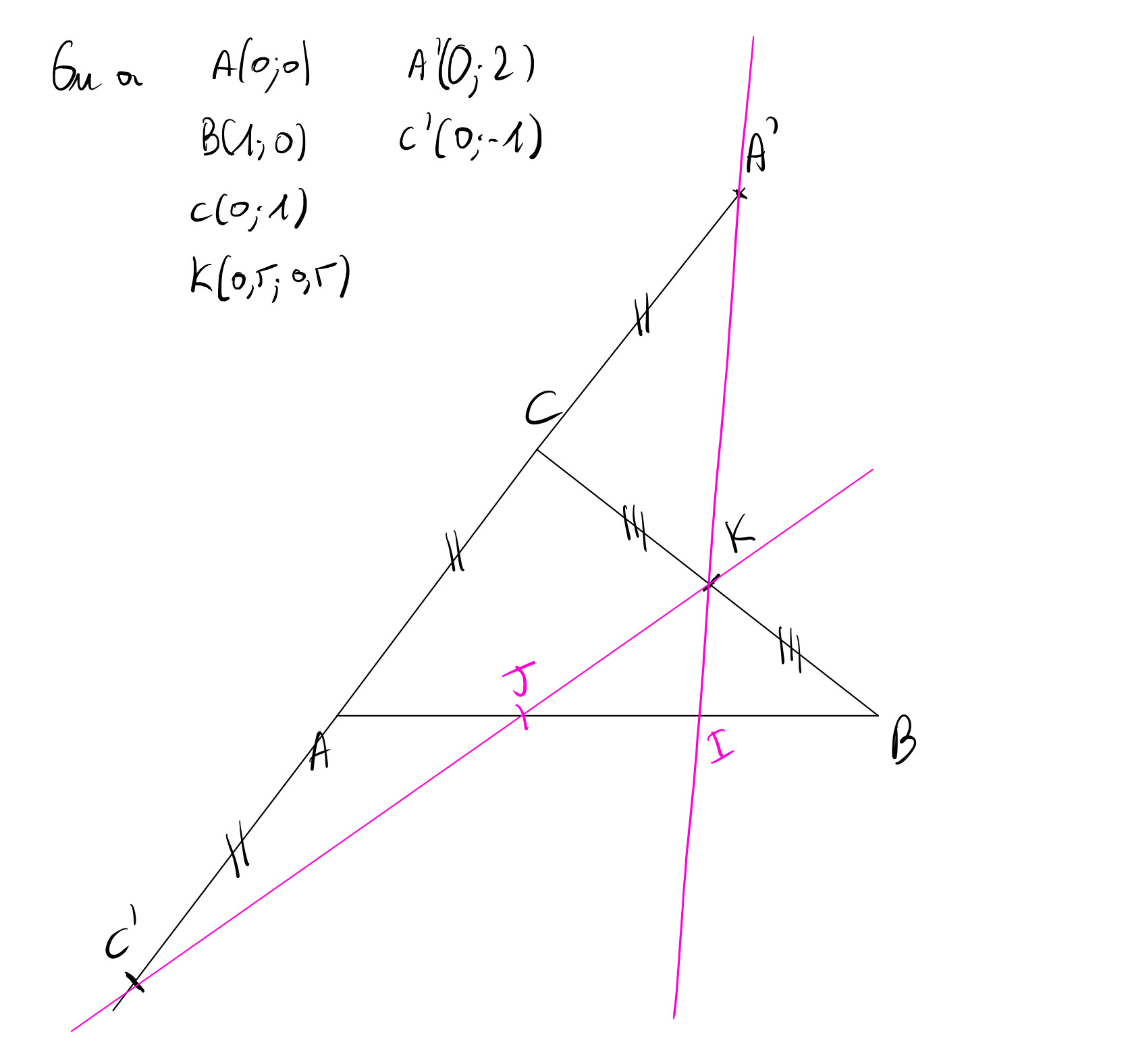 1) je cherche dans un premier temps les coordonnées des points A(0.0) B(1,0) C(0,1) A’(0,2) C’(0,-1) K(0,5;0,5)