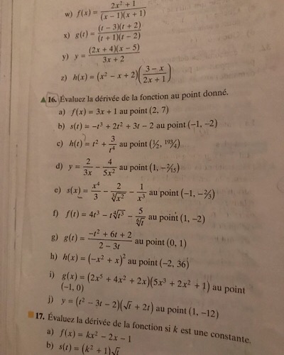 Alors pour le 16) à) je rencontre de la difficulté je ne vois pas par quoi commencer pour faire la dérivée sachant qu’on dit au point(3,7) en bref quoi faire avec les points pour avoir la bonne dérivée.