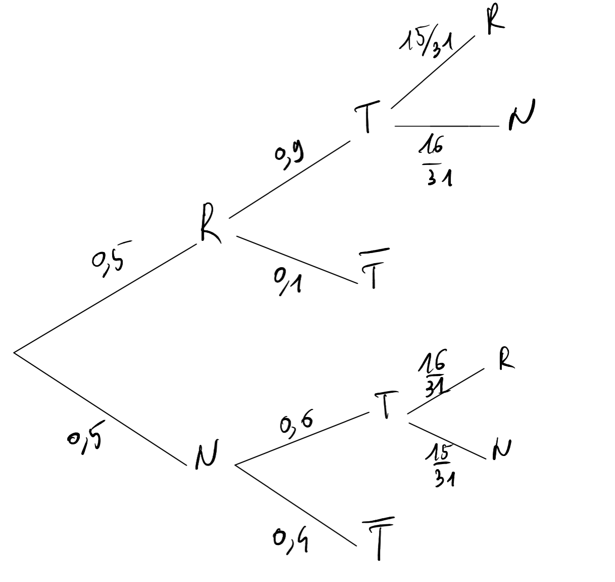 Si on suit ta logique alors \(P(RR)=\dfrac{16}{32}\times 0,9\times \dfrac{15}{31}\) car ce sont des probabilités "composées", c'est-à-dire qu'elles s'enchainent : on multiplie les probabilités rencontrées le long du chemin.