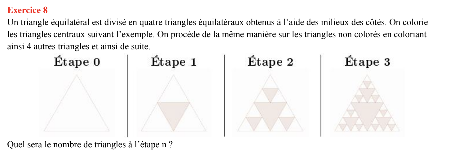 Le deuxième exercice porte sur les suites numériques. Je dois trouver une formule explicite qui me permette de trouver le nombre de triangles (coloriés ou pas je ne sais pas...) d'une étape n, avec le triangle de Sierpinski. J'ai trouvé une possible suite par récurrente pour calculer le nombre de triangles totaux : U0= 1 ; Un+1= 3Un +1. Mais je n'arrive pas à passer à une formule explicite à partir de là... (-exercice 8)