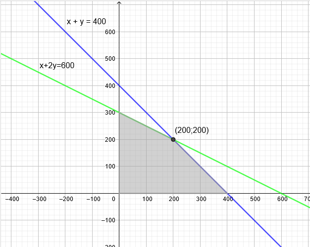 \(x ≥ 0, y ≥ 0\) En faisant le graphique pour l'optimisation, on trouve donc \(x=y=200\) ce qui donne \(z=5200000\)